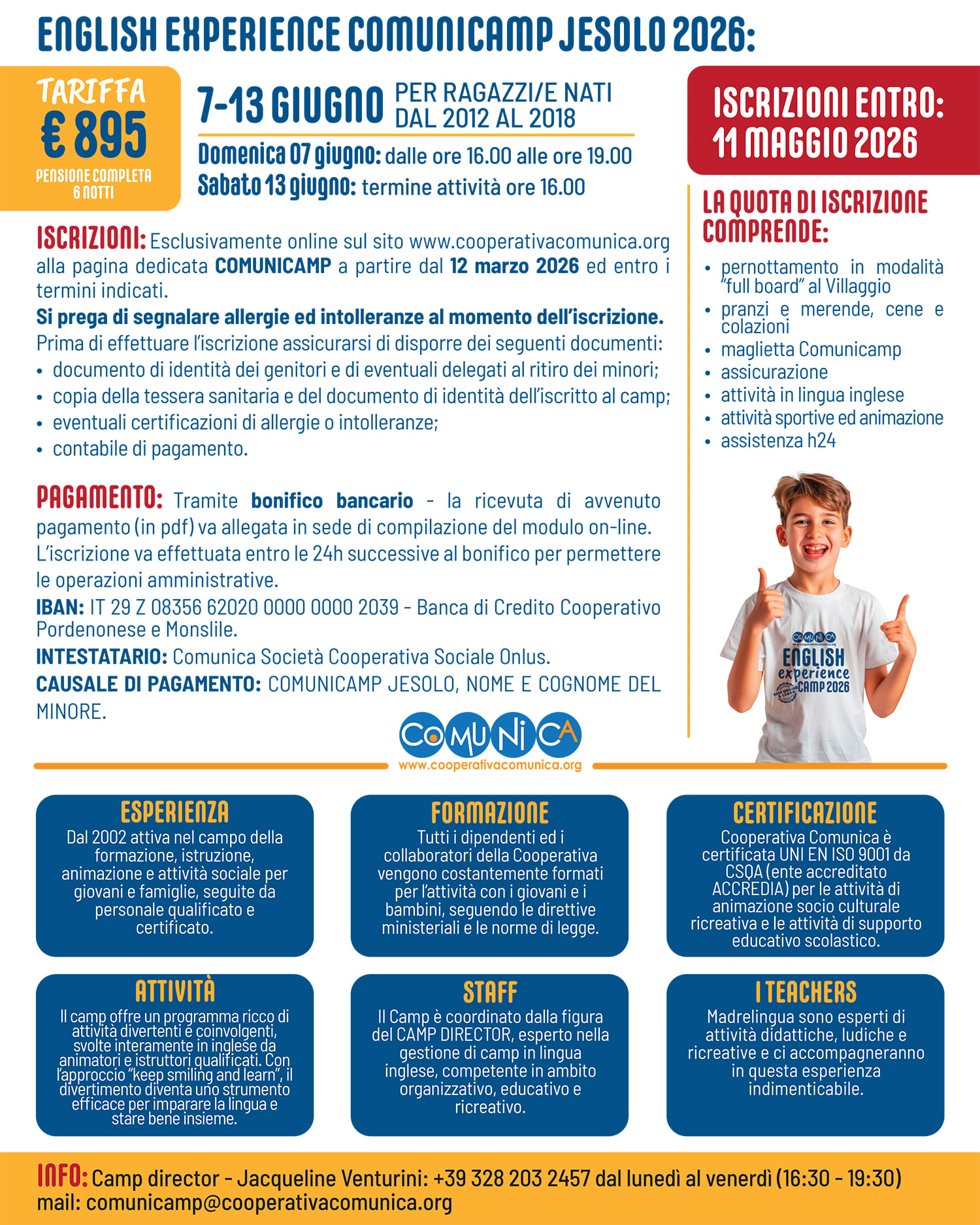 IBAN IT29Z0835662020000000002039 Banca di Credito Cooperativo Pordenonese e Monsile INTESTATARIO: Comunica Cooperativa Sociale ONLUS CAUSALE: COMUNICAMP JESOLO, NOME COGNOME DEL MINORE. La tariffa è indicata nel materiale informativo contenuto nel presente modulo.